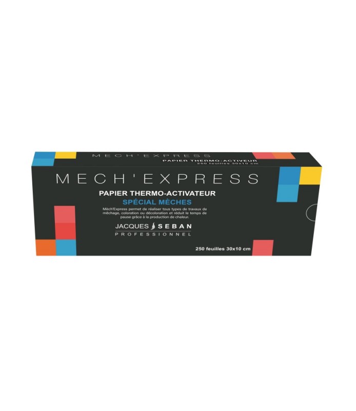 Le papier mèche thermique activateur de chaleur MECH'EXPRESS de JACQUES SEBAN permet de réaliser tous types de travaux de méchages, coloration ou décoloration et réduit le temps de pause grâce à la production de chaleur.