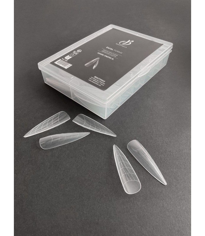 Méthode de rallongement révolutionnaire pour créer des extensions modernes avec un C Curve. Les Dual Forms permettent de réaliser rapidement le rallongement des ongles. Grace à leur apex, ces Dual Forms s’adaptent parfaitement aux ongles naturels et permettent de réaliser des extensions sans chablons, ni capsules. La pose permet d’obtenir des parallèles correctes pour bien placer l’apex. Graduées pour mieux placer la matière et maitriser la longueur.