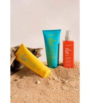 Lait démêlant et protecteur à utiliser avant, pendant et après l'exposition au soleil. Enrichi en filtres UV, niacinamide et jus de raisin pour une protection maximale contre les effets desséchants du soleil, du sel et du chlore, prévenant ainsi la décoloration et le dessèchement des cheveux.