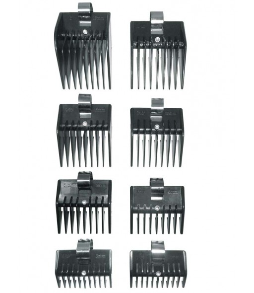 Ces contre-peignes sont vendus par 8 pour raser à différentes hauteurs : 1 mm, 3 mm, 6 mm, 9 mm, 12 mm, 15 mm, 18 mm et 25 mm.