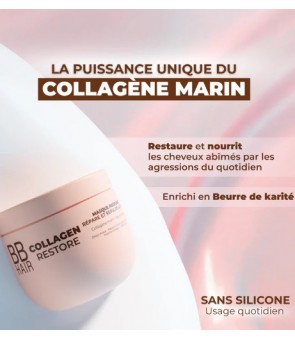 - Un Masque Profond qui est un soin riche et crémeux formulé pour offrir une nutrition intense et repulper les cheveux abîmés. Sa formule au collagène marin contribue à améliorer l’aspect de la fibre capillaire, en ciblant les zones les plus endommagées, tout en aidant à redonner du corps et de la tenue aux longueurs. Associé au beurre de karité, ce soin nourrit sans alourdir, pour des cheveux visiblement plus doux, plus souples et plus faciles à coiffer.