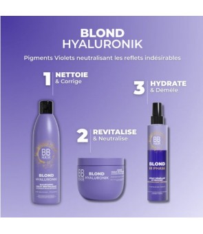- Un Masque Violet Neutralisant Blond Hyaluronik qui est un soin intense qui corrige les reflets indésirables de tous les blonds (décolorés ou méchés) pour des cheveux éclatants et revitalisés.
