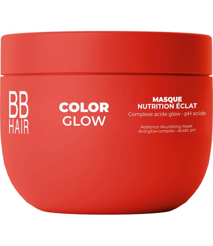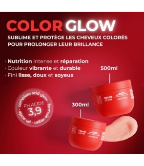 Le Masque Nutrition Éclat COLOR GLOW nourrit la fibre, scelle les pigments et prolonge l’éclat des cheveux colorés grâce à son pH acide 3,9. Formulé avec le Complexe Acide Glow, il lisse, protège et révèle une brillance miroir durable.