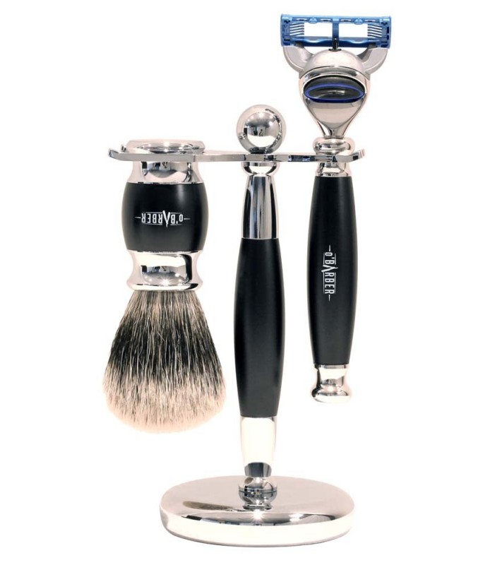 Le coffret O'BARBER est un kit de rasage complet comprenant un rasoir, un blaireau pur blaireau et un support.