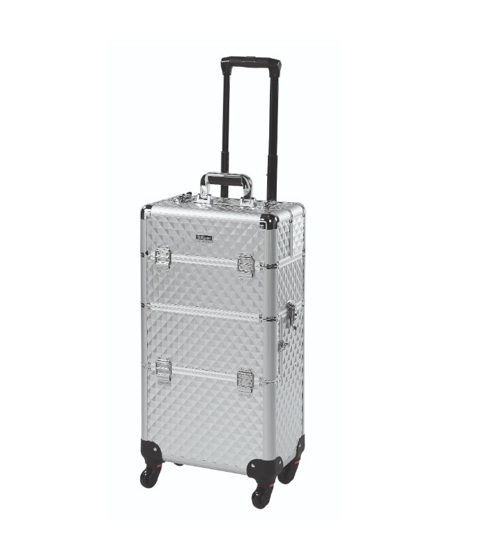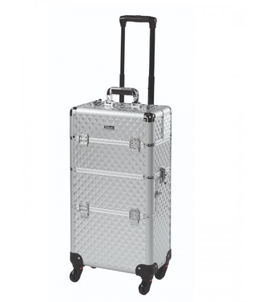 Trolley pratique en aluminium permettant plusieurs applications. L’organiser du haut est amovible et possède des compartiments de rangement pratiques. Avec ses 8 compartiments, la valise à roulettes offre tout l’espace nécessaire pour votre maquillage