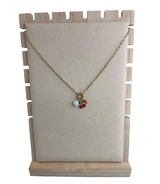 Collier avec un petit pendentif cerise, ainsi que des petites perles rouge et blanche.