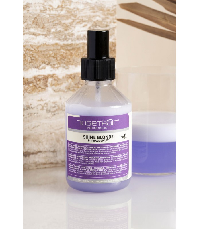 Soin instantané formulé à partir de pigments purs qui minimise le jaunissement et permet d'obtenir des tons neutres et froids. Grâce à sa formule biphasée spéciale et à ses filtres UV, il crée un film qui enveloppe la fibre capillaire, la protégeant des agressions extérieures et sublimant la brillance pour une couleur éclatante et longue tenue. La phase blanche agit en externe sur la cuticule, tandis que la phase jaune agit en profondeur sur le cortex.