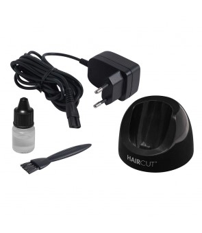 Livrée avec : 4 contre-peignes (3, 6, 9, 12mm), 1 burette d'huile, 1 brosse de nettoyage, 1 socle de charge.
